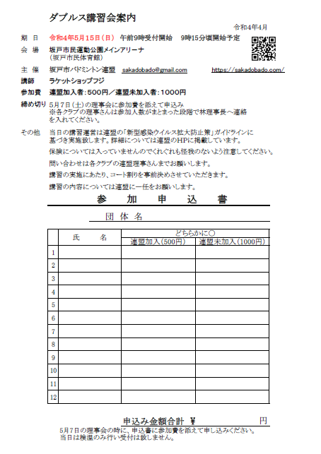 坂戸バドミントン連盟の講習会ですので、連盟クラブ以外の参加はご遠慮して頂いています。
