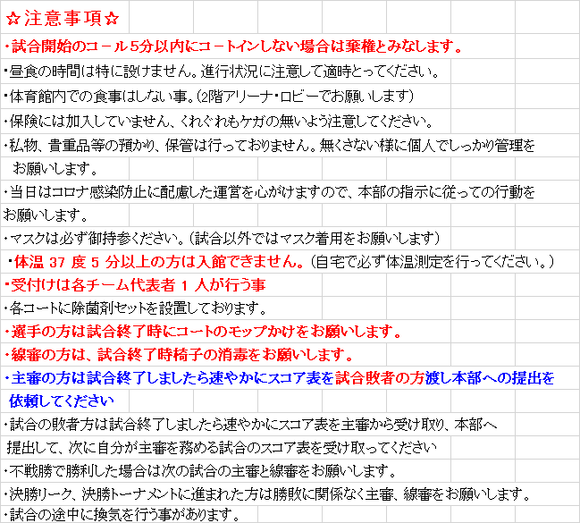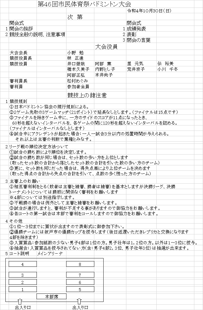 10/30坂戸市民体育祭プログラム 大会情報 2022.10.29 2022.10.23 日時:10月30日(日) 受付8:45~ 試合開始9:15~ 集合しての開会式は行いません。又、プログラムの配布は致しませんので、必ず式次第と注意事項をご覧になってご来場ください。